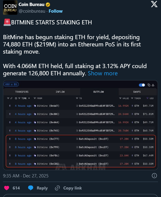 Bitmine hat in den vergangenen Tagen weitere rund 79.300 ETH in das Ethereum-Staking eingebracht. Damit beläuft sich die insgesamt gestakte Menge des Unternehmens inzwischen auf über 154.000 ETH, was einem Marktwert von mehr als 450 Millionen US-Dollar entspricht. Die Einzahlungen erfolgten über mehrere Wallets hinweg und wurden in sogenannten BatchDeposit-Verträgen gebündelt. Besonders bemerkenswert ist der Kontext dieser Maßnahme: Bitmine hat seine Ethereum-Bestände in den vergangenen Wochen deutlich ausgebaut und hält mittlerweile über 4 Millionen ETH.