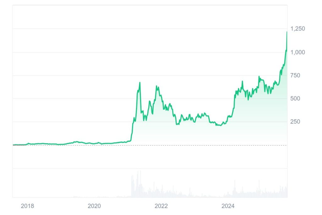 Der Binance Coin hat in den vergangenen Tagen eine starke Rallye hingelegt und erstmals in seiner Geschichte die Marke von 1.200 $ überschritten. Damit setzt der native Token der BNB Chain seinen Aufwärtstrend fort und zeigt sich deutlich stärker als viele andere Large-Cap-Kryptowährungen. Besonders bemerkenswert: Das neue Allzeithoch wurde erreicht, obwohl die On-Chain-Aktivität noch unter früheren Spitzenwerten liegt.