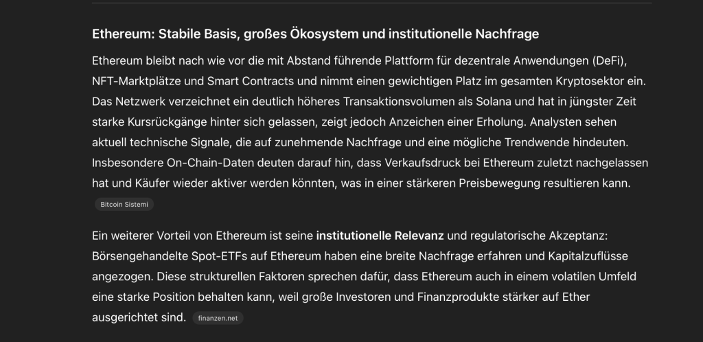 Während Solana und andere Chains zwar wachsen, findet der überwiegende Teil der DeFi-Wertschöpfung weiterhin auf Ethereum statt. In einem unsicheren Marktumfeld schätzt ChatGPT außerdem die geringere Volatilität von ETH als Vorteil.