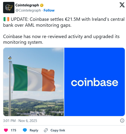 Coinbase, eine der größten Kryptowährungsbörsen weltweit, hat einer Geldstrafe von 24,7 Millionen US-Dollar in Irland zugestimmt, nachdem Schwächen in den Überwachungssystemen für Transaktionen festgestellt wurden. Die Strafe wurde verhängt, weil irische Aufsichtsbehörden zwischen 2021 und 2022 Mängel in den Geldwäschebekämpfungs- und Überwachungsprozessen von Coinbase entdeckten, die dazu führten, dass potenziell verdächtige Transaktionen unentdeckt blieben.