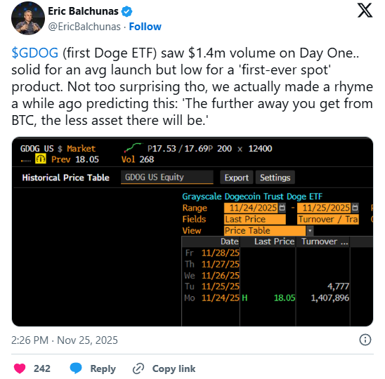 Der Top-Analyst Eric Balchunas gehört zu den bekanntesten ETF-Spezialisten von Bloomberg. Ein besonderes Augenmerk von Balchunas liegt dabei derzeit natürlich auf den Krypto-ETFs. Deshalb fällt er immer wieder mit sehr treffsicheren Prognosen zu den Bitcoin-Spot-ETFs und den Ethereum-Spot-ETFs auf. In diesem Rahmen hat der Bloomberg-Analyst natürlich auch den Handelsstart des weltweit ersten Dogecoin-ETFs GDOG genauestens beobachtet. Und dieser hat ihn trotz eines Handelsvolumens von 1,4 Millionen US-Dollar am ersten Handelstag offenbar enttäuscht, wie er in einem Post auf X mitteilte.