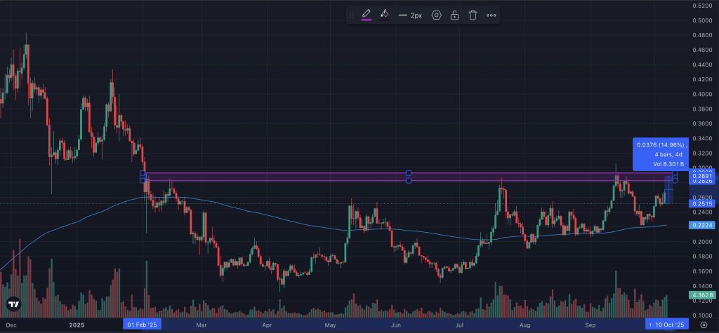 Aktuell notiert Dogecoin bei 0,25 Dollar und befindet sich damit in einer schwierigen technischen Situation. Im Bereich zwischen 0,28 bis 0,29 Dollar hat sich eine starke Widerstandszone gebildet, an der es in den letzten Monaten schon mehrmals zu einer starken Korrektur gekommen ist. Diese Widerstandszone liegt rund 15% über dem aktuellen Kursniveau.