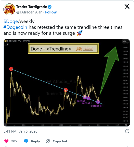 Auf Wochenbasis zeigt sich bei Dogecoin ein technisch sauberes Setup. Nach dem nachhaltigen Bruch einer langjährigen Abwärtstrendlinie konnte der Kurs das neue Unterstützungsniveau mehrfach bestätigen. Rückläufe im Frühjahr, Sommer und zum Jahresende 2025 wurden jeweils aufgefangen, was in der Charttechnik als Zeichen für eine stabile Basis gilt.