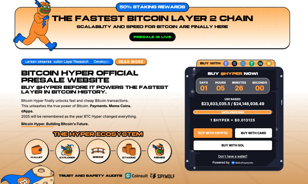 Das erklärt, warum heute so viele Anleger in die native Kryptowährung HYPER einsteigen wollen, bevor diese auf Kryptobörsen gelistet wird. Aktuell kann der Coin noch im Presale zu einem rabattierten Kurs von 0,013125 $ gekauft werden. So kam bereits eine Fundingsumme von 23,8 Millionen $ zusammen, was Bitcoin Hyper schon jetzt zu einem der erfolgreichsten Presale-Projekte des Jahres macht.