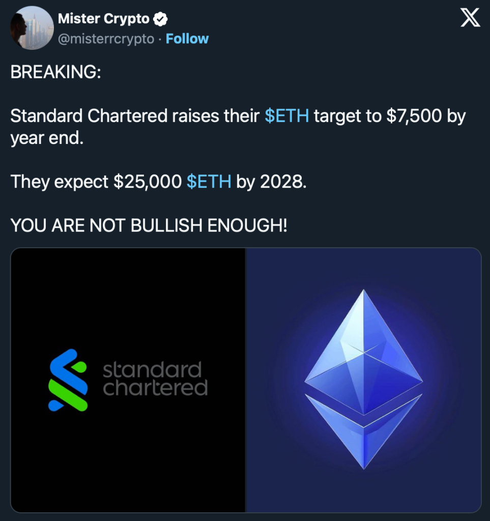 Standard Chartered hebt das Kursziel auf 7.500 US-Dollar an, gestützt auf ETF-Nachfrage, Corporate Treasuries und Ethereums Dominanz im Stablecoin-Ökosystem mit rund 40 Prozent der Blockchain-Gebühren.
