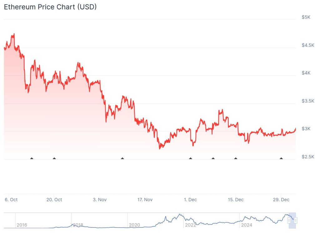Ethereum pendelt seit Wochen in einer engen Range zwischen 2.800 und 3.000 US-Dollar, nach einem dreimonatigen Abwärtstrend mit fast 30 Prozent Verlust. Diese Zone liegt im Zentrum eines mehrjährigen Aufwärtskanals und fungierte historisch als Unterstützung oder Widerstand.