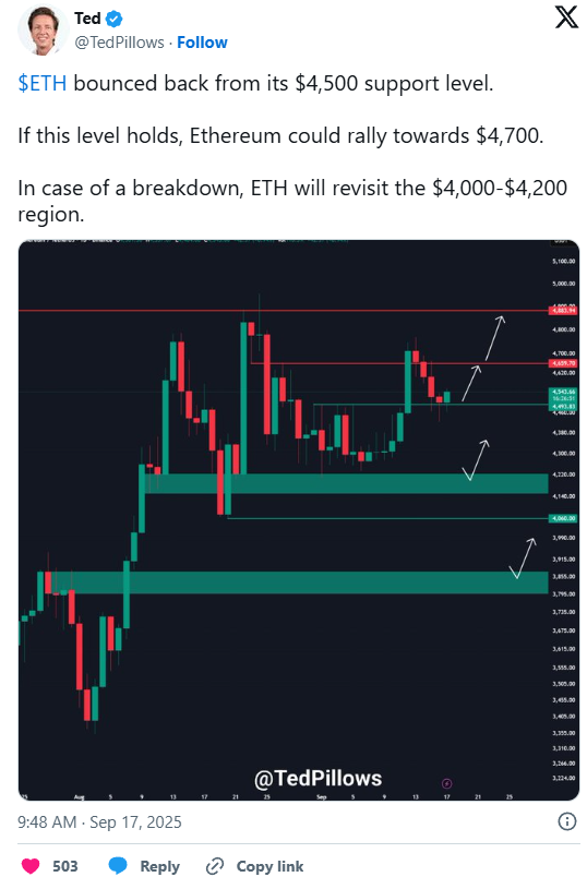 Ethereum hat sich zuletzt nach einem Rücksetzer am wichtigen Unterstützungsbereich von 4.500 US-Dollar stabilisiert. Nach Einschätzung von Analyst Ted könnte dieser Bereich die Grundlage für eine erneute Aufwärtsbewegung bilden. Sollte die Marke Bestand haben, wäre ein Anstieg in Richtung 4.700 US-Dollar das naheliegende Szenario.