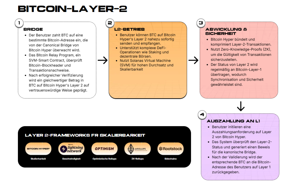 Diese Faktoren ebnen aktuell den Weg für ein neues Projekt mit dem Namen Bitcoin Hyper an. Das Projekt will dem Bitcoin Netzwerk die Skalierbarkeit geben, die Ethereum mit seinen Layer 2 Lösungen schon seit Jahren verfolgt. Bitcoin Hyper verbindet die Stabilität und Sicherheit von Bitcoin mit der Geschwindigkeit der Solana Technologie. Damit entsteht ein Ökosystem, das Transaktionen blitzschnell abwickeln und gleichzeitig auf der Bitcoin Blockchain absichern kann.