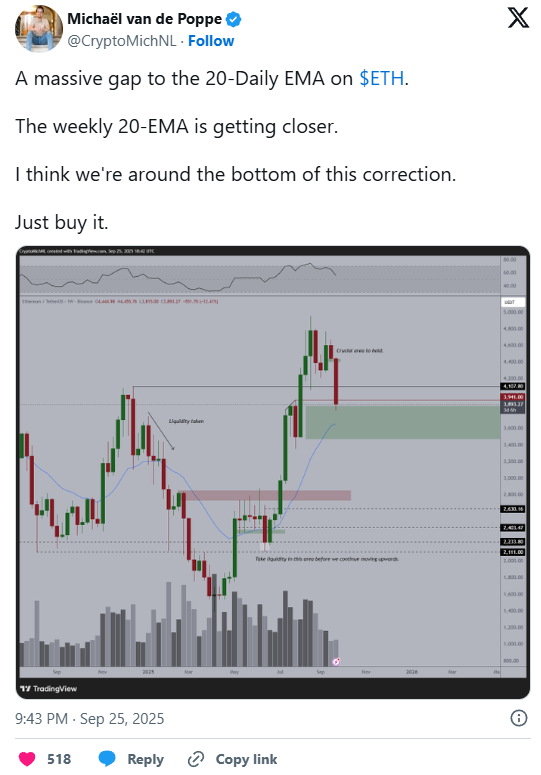 Ethereum fällt unter 4.000 Dollar: Analysten sehen Kaufchance vor möglichem Q4-Anstieg