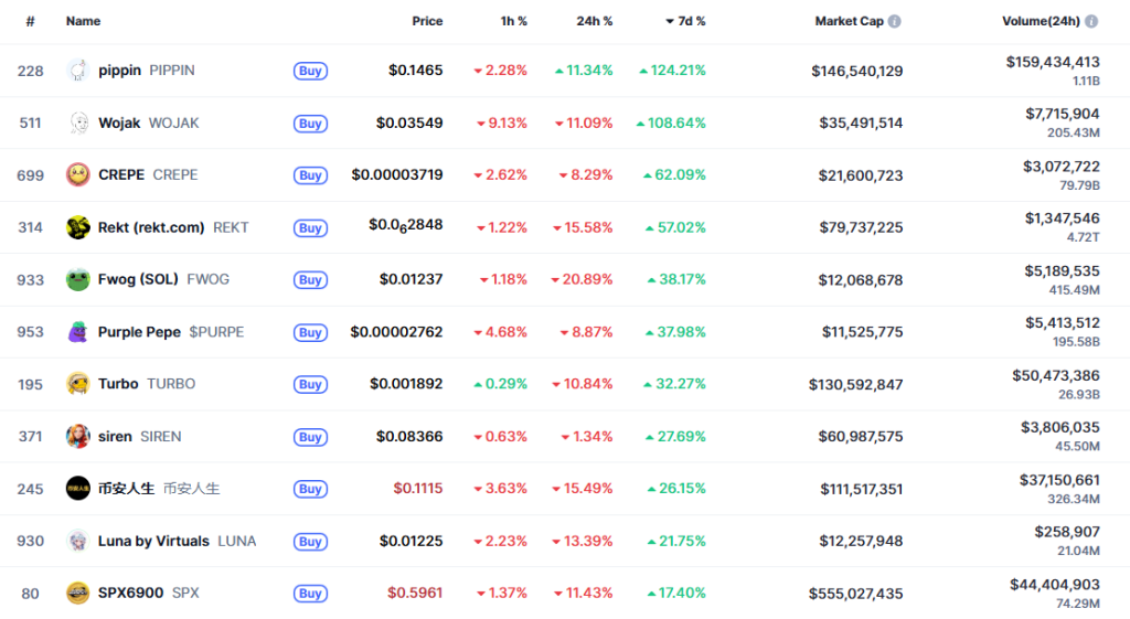 Während Ethereum und andere große Coins weiter unter Druck stehen, zeigte der Meme Markt vor einigen Tagen ein anderes Bild. Mehrere Segmente legten zuletzt zwischen 10 und 25 Prozent zu, vor allem die Murad Picks waren mit einem Wochenanstieg von 23 Prozent vorn. Aber auch bekannte Token wie SPX900 konnte in den letzten 7 Tagen um 20 Prozent steigern. Solana basierte Meme Coins legten 16,63 Prozent zu und AI orientierte Meme Projekte folgen knapp dahinter. Auch klassische Hunde und Katzen Themen meldeten Fortschritte. Lediglich der PolitiFi Bereich bildete mit einem leichten Rückgang die Ausnahme.