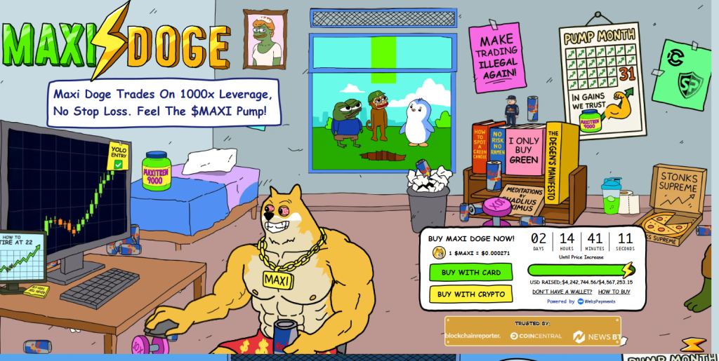 Auch der neue Mikrocap Hundtoken Maxi Doge ($MAXI) gewinnt rasant an Finanzmitteln. Die Mischung aus neuem Meme Konzept, auffälligem Markenauftritt und klarer Ausrichtung auf Unterhaltung trifft den aktuellen Zeitgeist innerhalb der Szene. Der Presale hat bereits 4,24 Millionen US-Dollar eingesammelt und der Preis bei 0,000271 soll in zwei Tagen steigen.