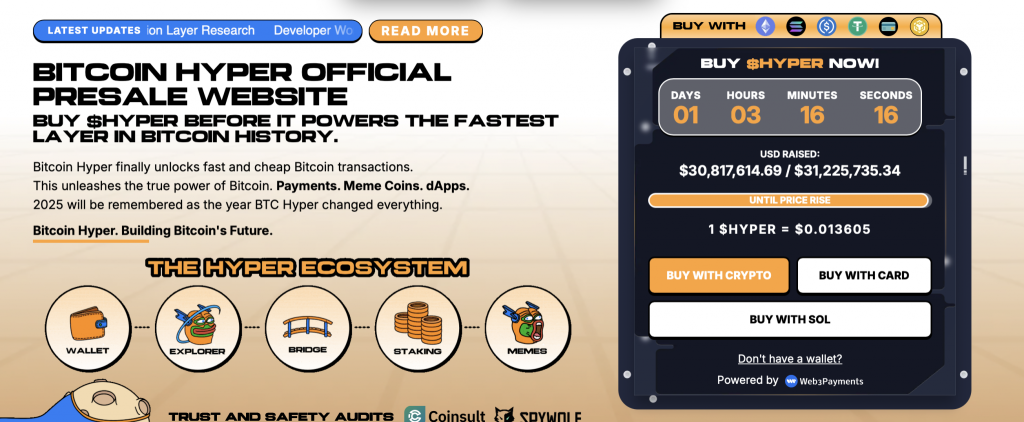 Während Ethereum seine Vorreiterrolle bei institutionellen Anwendungen ausbaut, gewinnt auch Bitcoin durch Layer-2-Lösungen an Funktionalität. Bitcoin Hyper hat im Presale bereits mehr als 30,7 Millionen US-Dollar eingesammelt und zielt darauf ab, Bitcoin über seine Rolle als reiner Wertspeicher hinaus zu erweitern. Native BTC werden über eine spezielle Bridge in das System eingebracht und dort in gedeckter Form für neue Anwendungen nutzbar gemacht.