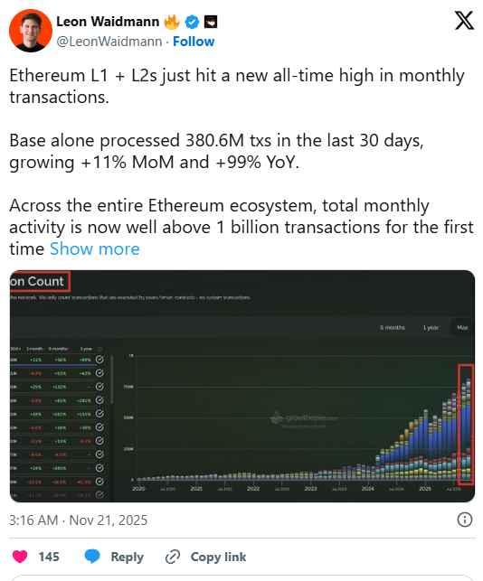 Die neuen Daten aus dem Ethereum-Ökosystem unterstreichen ein robustes Wachstum. Die Aktivität über Layer 1 und Layer 2 erreicht erstmals mehr als eine Milliarde Transaktionen pro Monat. Besonders stark zeigt sich Base, das innerhalb von 30 Tagen über 380 Millionen Transaktionen verarbeitet hat und damit sowohl monatlich als auch jährlich zweistellig wächst. Diese Dynamik signalisiert eine strukturell gesunde Entwicklung.