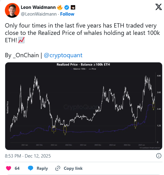 On-Chain-Daten zeigen, dass sich der Kurs nahe an der Marke bewegt, an der Wale ihre $ETH gekauft haben. Wallets, die mehr als 100.000 $ETH halten, sind nur knapp unter dem aktuellen Kurs eingestiegen. Der Kurs ist in der Vergangenheit immer stark gestiegen, wenn dieses Niveau erreicht wurde.
