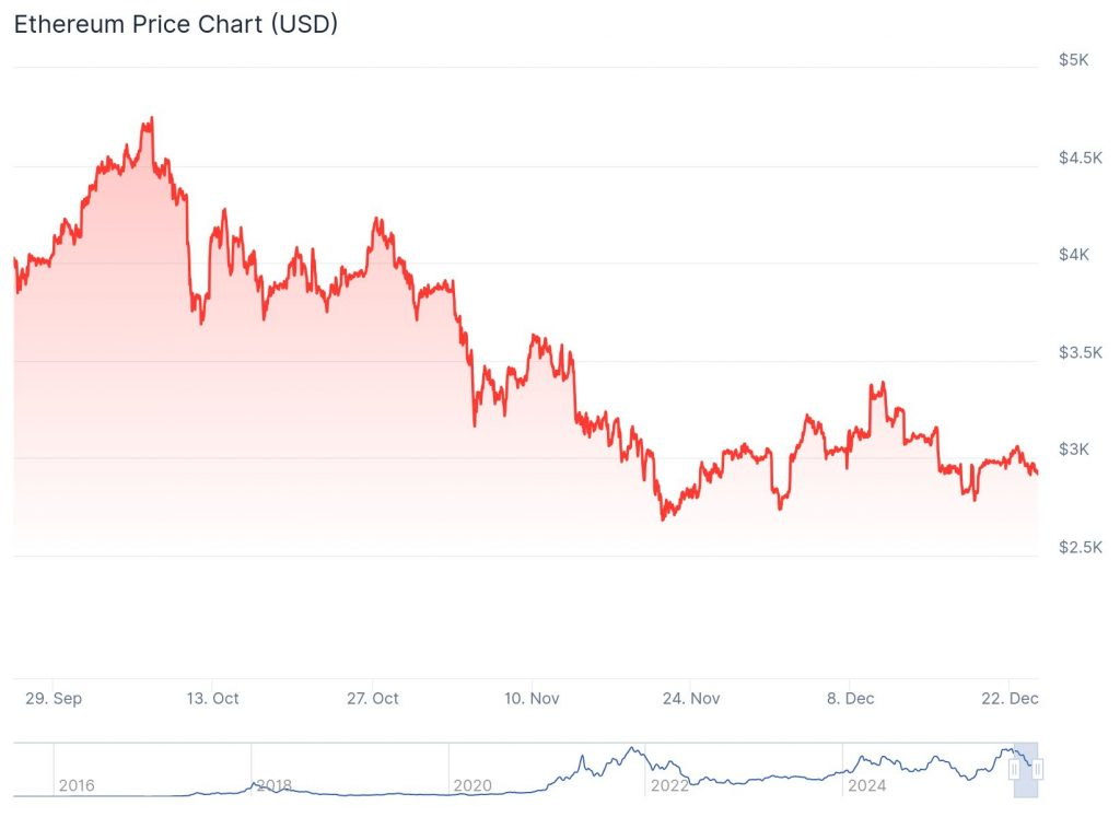 Auch prominente Investoren passen ihre Strategie an. BitMEX-Co-Founder Arthur Hayes trennte sich zwischen dem 19. und 20. Dezember von mehr als 1.100 ETH und verlagerte Kapital in ausgewählte DeFi-Projekte. Technisch betrachtet ist die Lage ebenfalls heikel: Ethereum ist unter die 100-Tage-EMA im Wochenchart gefallen, ein Signal, das in der Vergangenheit teils massive Kursverluste nach sich zog. In vergleichbaren Situationen verlor ETH 49 Prozent im Jahr 2022 und 37 Prozent Anfang 2025. Sollte die Unterstützung bei 2.800 US-Dollar brechen, rückt ein Rücksetzer in Richtung 1.600 US-Dollar in den Bereich des Möglichen.
