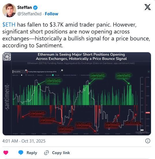 Die aktuelle Kursbewegung von Ethereum zeigt den Kampf zwischen Short- und Long-Tradern. Das Asset fiel kürzlich unter 3.700 USD aufgrund gestiegener Marktunsicherheit, doch ein genauerer Blick zeigt eine interessante Gegenbewegung. Die Analytics-Firma Santiment berichtet, dass Short-Positionen auf großen Börsen stark gestiegen sind, was historisch oft zu einem Short Squeeze führt.