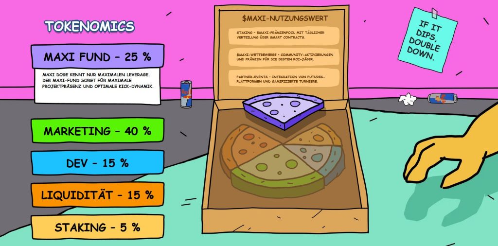 Die Tokenomics des MAXI-Tokens zeigen, dass insgesamt 150,24 Milliarden Coins als Maximalmenge nach dem Token Generation Event (TGE) existieren werden und keine weiteren Token nachkommen sollen. Insgesamt 5 Prozent aller Maxi Doge Coins werden zudem für das Staking-Programm reserviert.