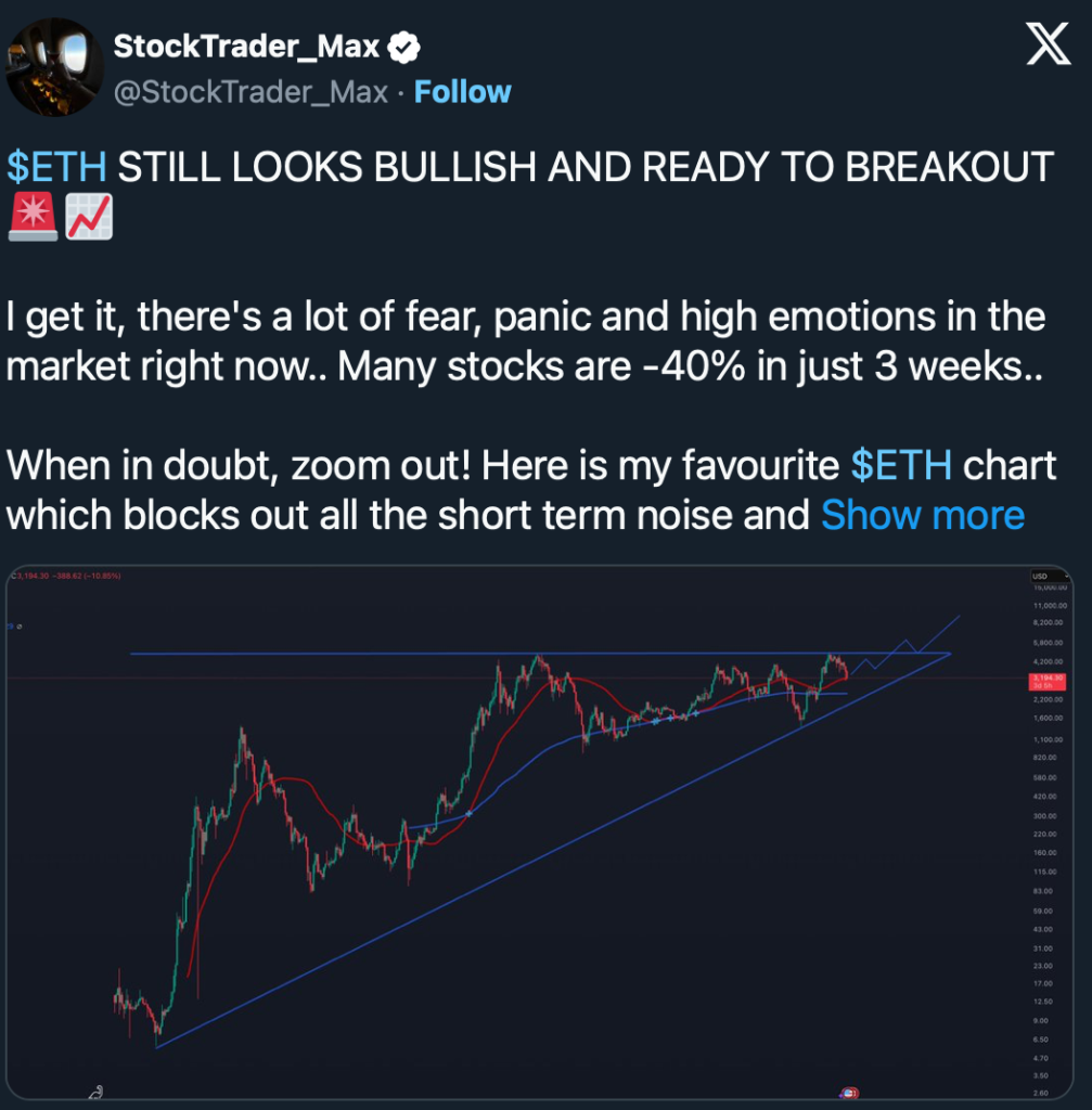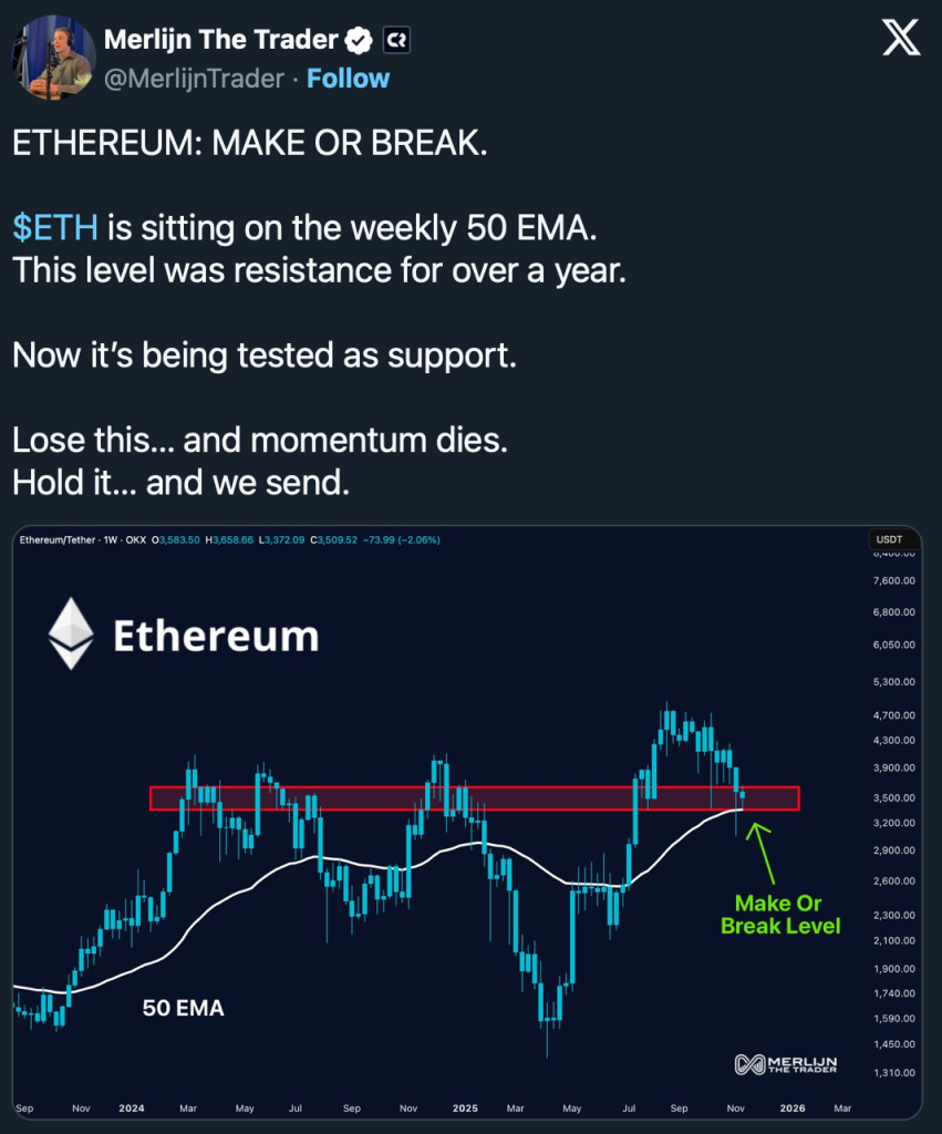 Chartanalyst Merlijn The Trader betont, dass Ethereum aktuell genau am Weekly-50-EMA angekommen ist – einem Bereich, der in der Vergangenheit oft als entscheidende Unterstützung gedient hat. Sollte dieser Bereich halten, könnte ein deutlicher Rebound folgen. Ein Verlust der 3.200-Dollar-Zone würde das Bild jedoch klar eintrüben.