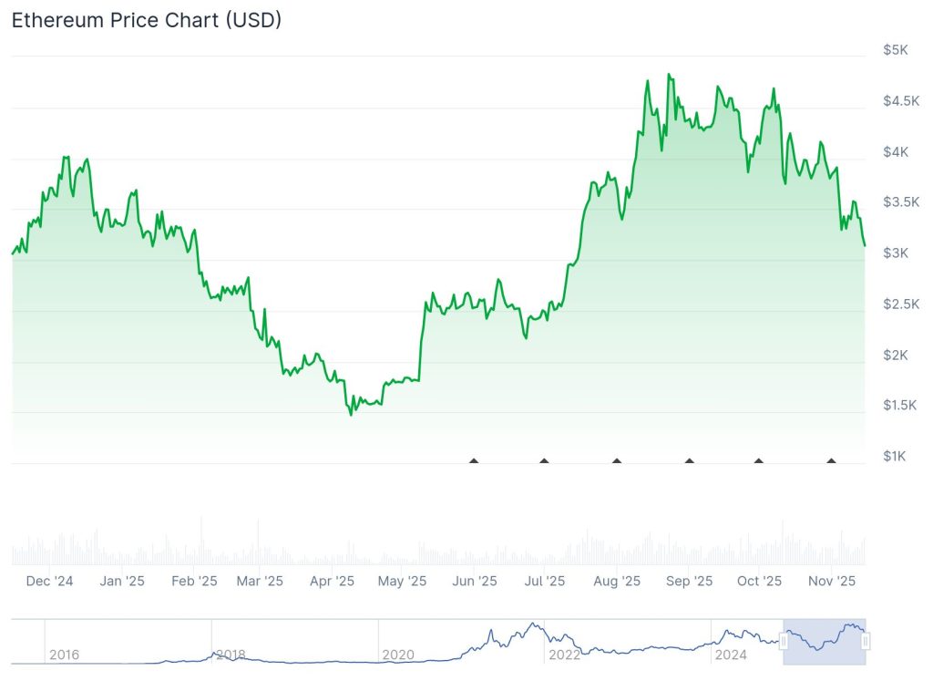Die Entwicklung der letzten Wochen zeigt: ETH konnte sich nach dem Sommerhoch zunächst über 4.000 US-Dollar halten, rutschte dann aber im Zuge wiederholter Korrekturen deutlich ab. Besonders die kurzfristigen Flash-Crashs der vergangenen zwei Wochen belasteten den Markt zusätzlich. Mit dem heutigen 9-%-Rückgang handelt ETH nun unter 3.200 US-Dollar, die Marktkapitalisierung fiel unter die Schwelle von 400 Milliarden US-Dollar.