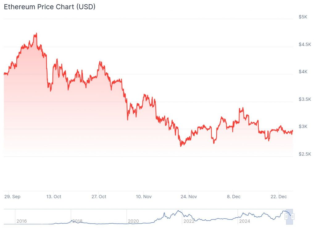 Während die langfristige Roadmap Hoffnung macht, bleibt das aktuelle Marktbild von Ethereum angespannt. Der Kurs bewegt sich weiterhin unterhalb der psychologisch wichtigen 3.000-US-Dollar-Marke und notiert zudem unter dem 200-Tage-EMA, der von vielen Tradern als Trennlinie zwischen Bullen- und Bärenmarkt betrachtet wird. Momentum-Indikatoren spiegeln diese Unsicherheit wider: Der RSI verharrt im Bereich niedriger 40er-Werte, was auf fehlende Aufwärtsdynamik hindeutet.