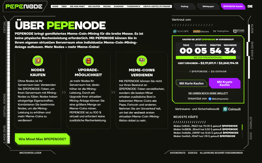 Der übergeordnete Trend bleibt intakt, auch wenn die kurzfristige Dynamik fehlt. Damit könnte jetzt der optimale Zeitpunkt sein, um in alternative, kleine Projekte mit hohem Entwicklungspotenzial zu investieren. Spannend beispielsweise der Ansatz von PepeNode: Anstatt Rechenleistung im Mining zu verbrauchen, baut PepeNode auf eine virtuelle Spielmechanik. Nutzer können mit PEPENODE Token digitale Mining Nodes erwerben und ihre virtuelle Serverfarm ausbauen. Dadurch entsteht eine spielerische Simulation echter Mining Prozesse, nur eben ressourcenschonend und unterhaltsam.