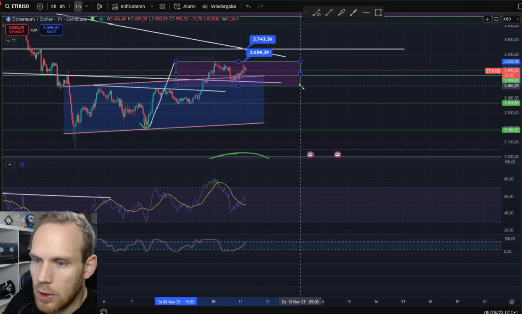 Ethereum startet ruhig in die neue Woche. Nach den gestrigen Aufwärtsbewegungen kämpft der Kurs aktuell mit klaren Widerständen und zeigt eine ähnliche Struktur wie Bitcoin, allerdings etwas schwächer. Auf Vier-Stunden-Basis liegt die entscheidende Zone bei rund 3.650, eine Marke, die zuletzt mehrfach getestet, aber noch nicht nachhaltig überwunden wurde. Solange der Kurs darunter bleibt, dominiert die Seitwärtsbewegung.