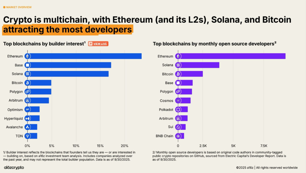Die neue Analyse von a16z Crypto verdeutlicht, dass sich der Wettbewerb um Entwickler im Blockchain-Sektor intensiviert und Ethereum weiterhin an der Spitze steht. Jesse Pollak, der Gründer von Base betont, dass Ethereum und Base aktuell die beliebtesten Plattformen für Gründer und Entwickler sind. Laut der Studie bleibt der Kryptomarkt zwar „multichain“, doch Ethereum, inklusive seiner Layer-2s, zieht 2025 die meisten neuen Entwickler an.