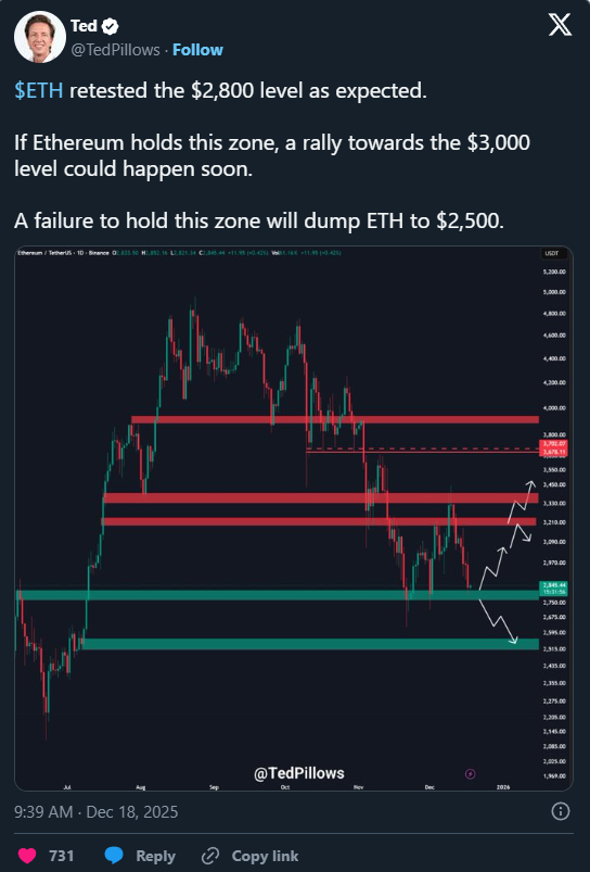 Wie es für Ethereum weitergeht, hängt maßgeblich davon ab, wie sich der restliche Kryptomarkt entwickelt und ob Bitcoin wieder zu alter Stärke zurückfindet. Analysten wie Ted Pillows sehen für ETH aktuell mehrere mögliche Szenarien. Ihm zufolge ist es zunächst ein positives Signal, dass ETH die 2.800-Dollar-Marke bislang halten konnte. Sollte es den Bullen gelingen, dieses Niveau weiter zu verteidigen, könnte schon bald ein erneuter Angriff auf die 3.000-Dollar-Zone folgen.