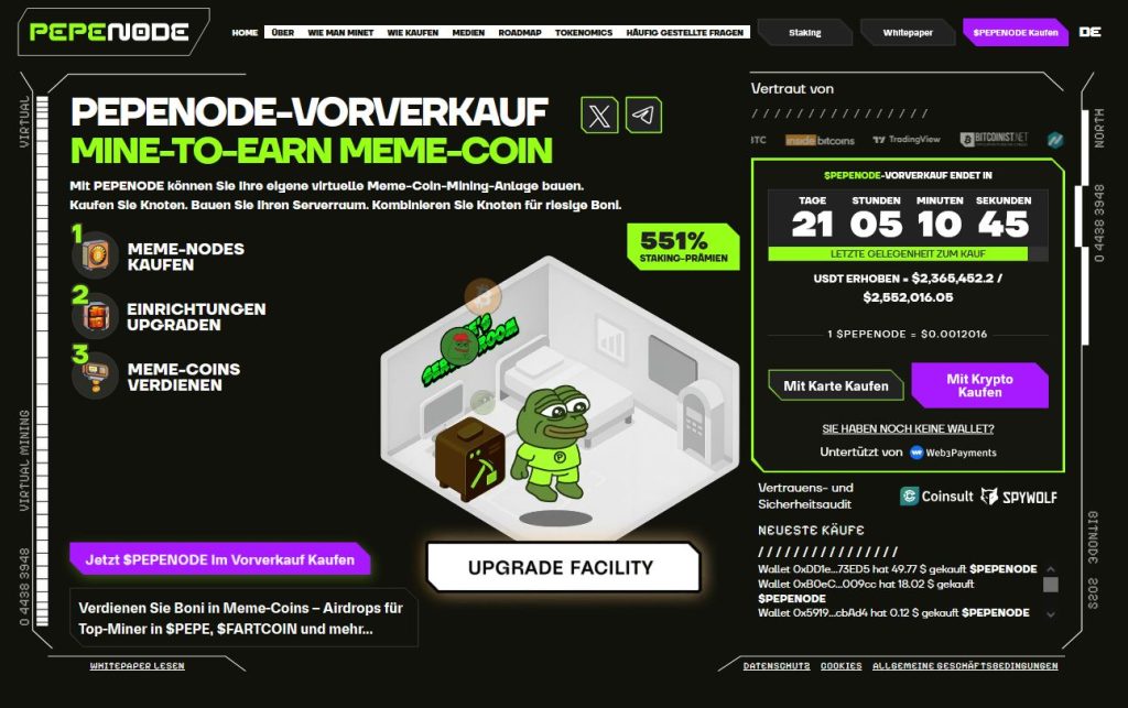 Aktuell scheint das Interesse vieler Krypto-Anleger jedoch von den etablierten Coins zu jüngeren Projekten zu wechseln, die Chancen auf hohe Verdienste versprechen. Gerade innovative Konzepte wie PepeNode scheinen viele Anleger überzeugen zu können, da hier Forschung und Technologie im Vordergrund stehen. Gerade die Idee, Krypto-Mining in virtueller Form auf der Ethereum-Blockchain zu ermöglichen, scheint viele Investoren überzeugen zu können.