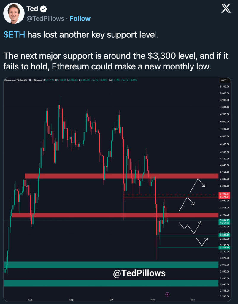 Nicht alle teilen den Optimismus. Der Analyst Ted Pillows warnt vor einem möglichen Rückfall in den Bereich von 3.150 bis 3.300 US-Dollar, falls ETH die 3.500-Dollar-Zone erneut nicht überwinden kann.