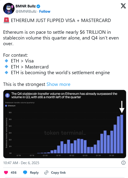 Die Zahlen sprechen für sich: Das Volumen könnte allein in diesem Quartal auf 6 Billionen Dollar steigen. Damit wickelt Ethereum mehr Zahlungsvolumen ab als Visa und Mastercard im selben Zeitraum. Dieser Vergleich zu den traditionellen Zahlungsriesen zeigt eindrucksvoll, welche Bedeutung Ethereum bereits heute im Finanzsektor hat.
