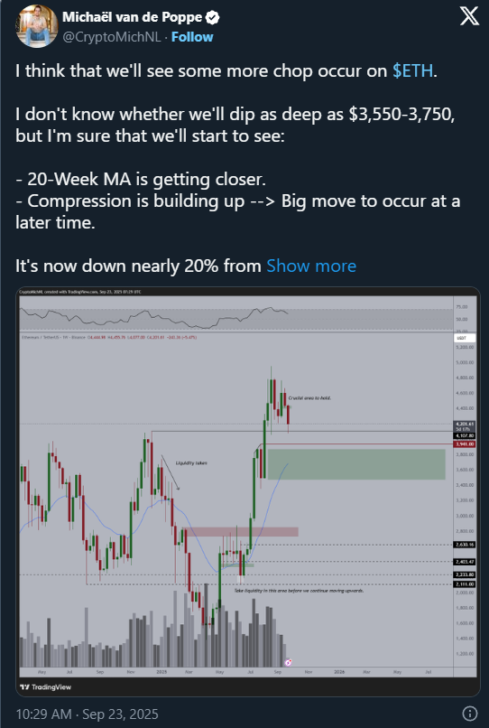 Der Analyst Michael van de Poppe hält es sogar für realistisch, dass ETH noch weiter absackt. Er hat die Zone zwischen 3.550 $ und 3.750 $ als wichtigsten Support identifiziert, auf den ETH zurückfallen könnte, falls es auch für den Rest des Krypto-Marktes weiter abwärts geht. Gleichzeitig hält er das jedoch auch für eine gute Chance, um noch einmal Ethereum für unter 4.000 $ zu akkumulieren. Langfristig ist nämlich auch van de Poppe positiv für die weitere Entwicklung von Ethereum eingestellt. Schließlich könnte ETH maßgeblich von den makroökonomischen Entwicklungen in Bezug auf Leitzinssenkungen in den USA profitieren.