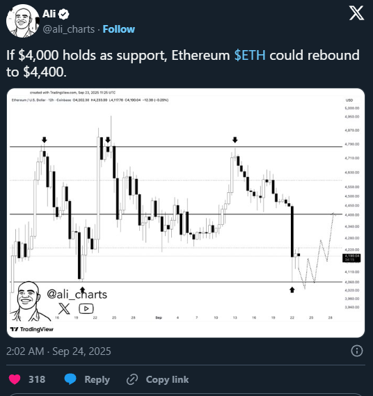 Jetzt befindet sich der Ethereum-Kurs sozusagen an einem Make-or-Break-Point. Falls er wieder unter die 4.000-Marke abrutscht, würde es mittelfristig eher schlecht aussehen. Der Analyst Ali Martinez identifiziert das 4.000-Niveau als wichtigste Unterstützungszone für den Ethereum-Kurs und hält einen weiteren Rückfall auf dieses Kursniveau für realistisch. Falls die 4.000-$-Marke hält, geht er jedoch von einer raschen Rebound-Rallye in Richtung 4.400 $ aus.