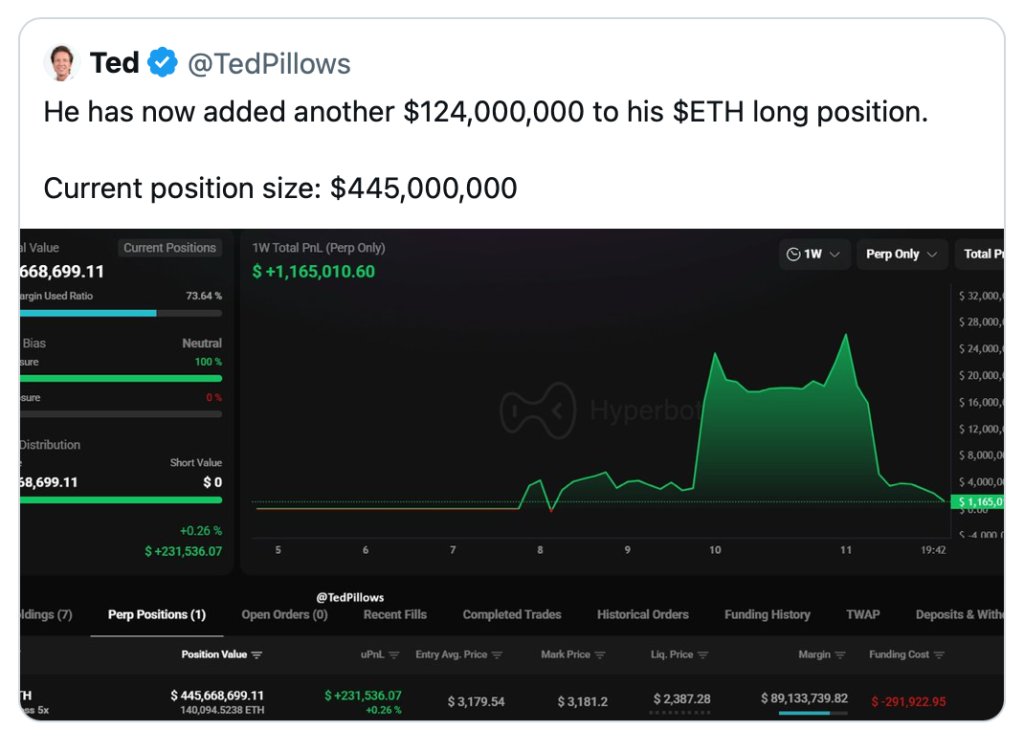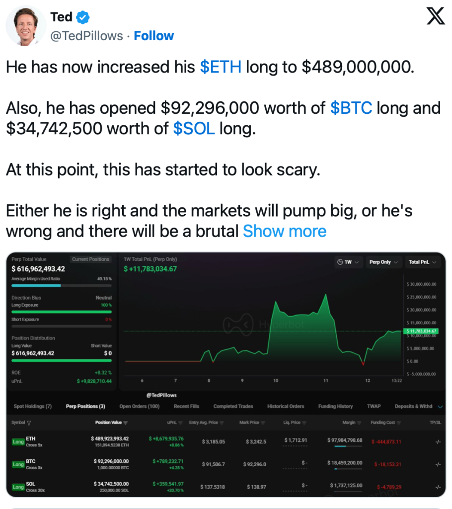 Ein Blick auf die On-Chain-Daten liefert ein klares Signal. Ein einzelner Trader hat jüngst eine stark gehebelte Long-Position auf Ethereum eröffnet, deren Volumen sich auf rund 489 Millionen US-Dollar beläuft. Zwar setzt dieser Investor auch auf steigende Kurse bei Bitcoin und Solana, doch Ethereum stellt den mit Abstand größten Teil der Position dar.