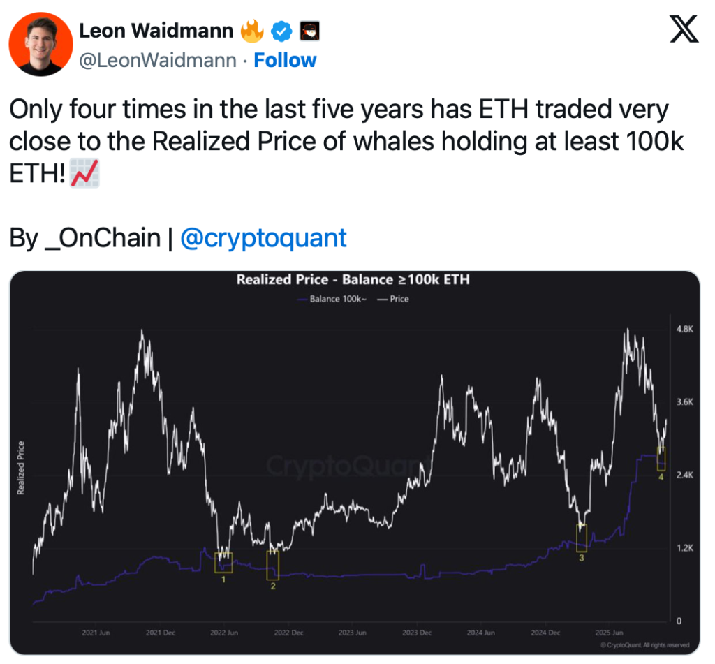 Zusätzlich zeigen On-Chain-Analysen, dass sich der Ethereum-Kurs aktuell in einer Zone bewegt, in der große Wallets ihre Bestände aufgebaut haben. Adressen mit mehr als 100.000 ETH sind nur knapp unter dem aktuellen Kursniveau eingestiegen. Historisch betrachtet folgten auf solche Phasen häufig kräftige Aufwärtsbewegungen.