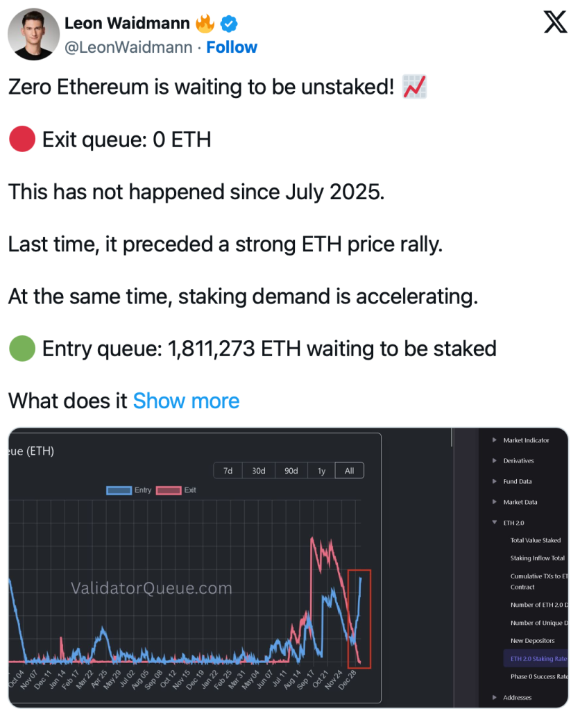 Erstmals seit Juli 2025 ist die Exit-Queue beim Ethereum-Staking komplett leer – kein einziger Ether wartet darauf, aus dem Staking abgezogen zu werden. Damals leitete dieser Zustand eine deutliche Kursrallye ein. Gleichzeitig stehen über 1,8 Millionen ETH in der Entry-Queue bereit, um neu gestakt zu werden.