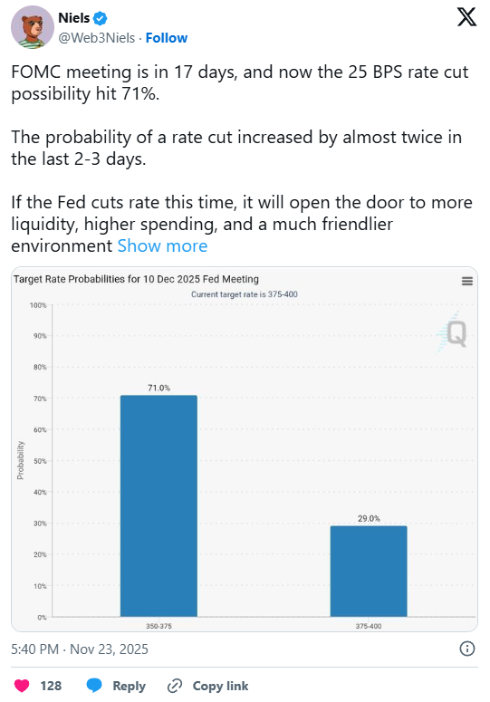 Damit sieht es stark danach aus, als würde es sich eher um eine Überreaktion der Marktteilnehmer handeln. Einer der Gründe, die für Unsicherheit gesorgt haben, war die Einschätzung, dass die Fed die Zinsen im Dezember nicht senken wird. Während man vor zwei Wochen noch überzeugt war, dass es keine Zinssenkung geben wird, steigen die Chancen auf niedrigere Zinsen nun doch. Die Wahrscheinlichkeit ist von 25 Prozent auf über 70 Prozent gestiegen. Niedrigere Zinsen bedeuten mehr Liquidität an den Märkten, weshalb frühere Zinssenkungen dem Kryptomarkt bisher mittel- bis langfristig immer in die Karten gespielt haben.