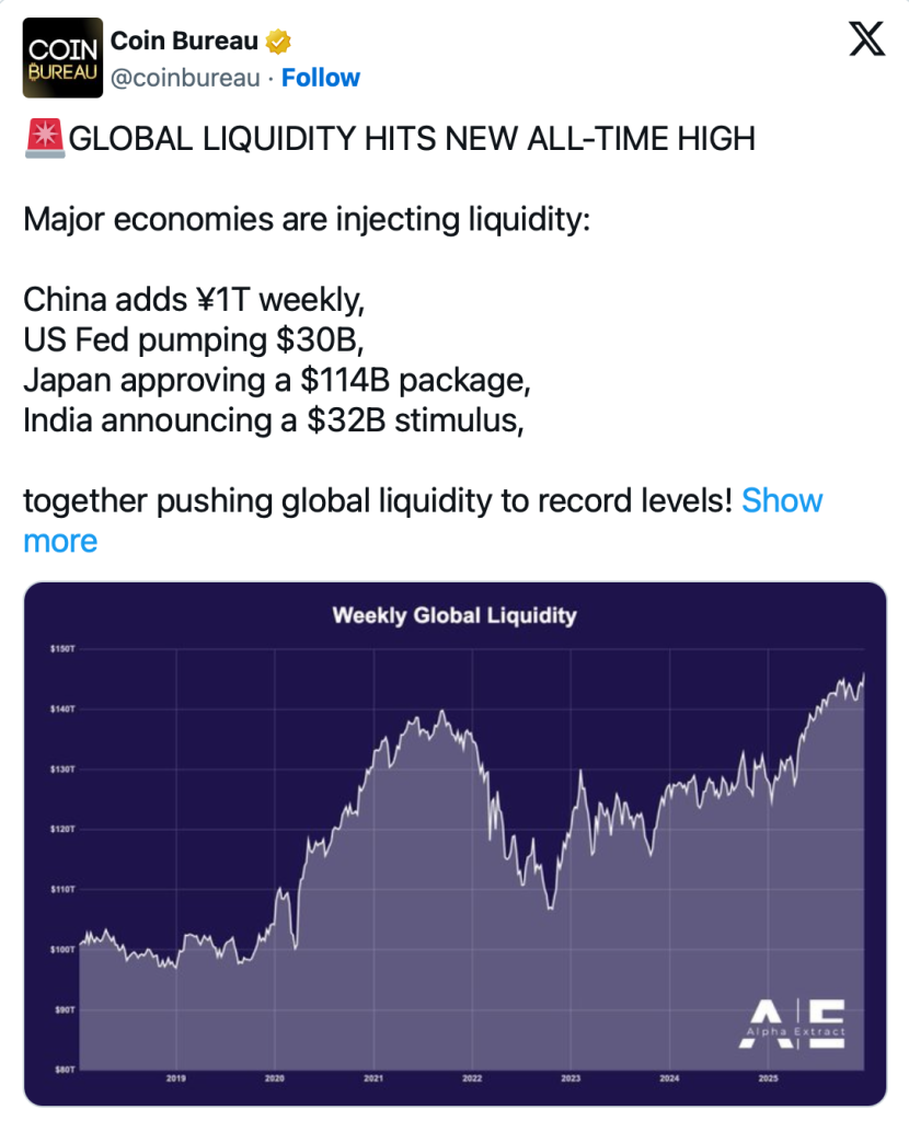 Die globale Liquidität hat ein neues Allzeithoch erreicht, hervorgehoben unter anderem von Coin Bureau. Auffällig ist die Gleichzeitigkeit der Maßnahmen: China erhöht wöchentlich die Liquiditätszufuhr um rund eine Billion Yuan, die US-Notenbank pumpt zusätzliche 30 Milliarden US-Dollar in das System.