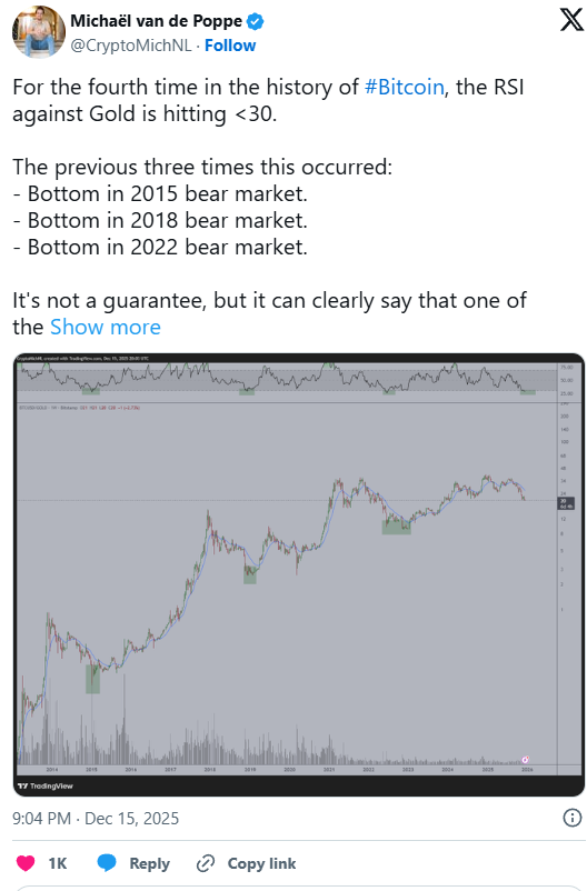 Ein RSI unter 30 im Verhältnis zu Gold signalisiert historisch eine starke Unterbewertung von Bitcoin. In den Jahren 2015, 2018 und 2022 markierte genau diese Konstellation jeweils wichtige Tiefpunkte im Bitcoin-Zyklus. Damals folgten mittelfristig deutliche Erholungen. Gleichzeitig zeigt der große Abstand zur 20-Wochen-Linie, dass Bitcoin relativ zu Gold stark überverkauft ist. Van de Poppe interpretiert das als Hinweis auf eine bevorstehende Rotation. Während Gold nach einer extremen Rallye überhitzt wirkt, könnte Kapital zunehmend aus Gold abfließen und in Bitcoin umschichten.
