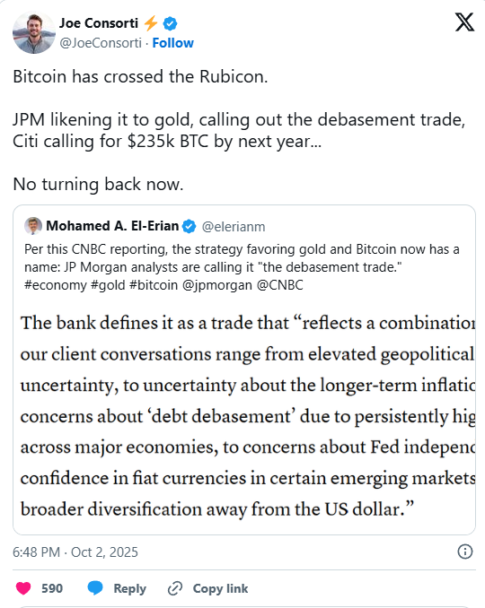 In aktuellen Einschätzungen von JP Morgan und Citibank zeigt sich, dass Bitcoin zunehmend als strategisches Anlageinstrument in unsicheren Zeiten betrachtet wird. JP Morgan beschreibt den Trend als „Debasement Trade”. Damit ist gemeint, dass Investoren Gold und Bitcoin als Schutz gegen die fortschreitende Entwertung staatlicher Währungen bevorzugen. Ursachen sind geopolitische Spannungen, Inflationssorgen, wachsende Staatsdefizite und die abnehmende Unabhängigkeit der Notenbanken.