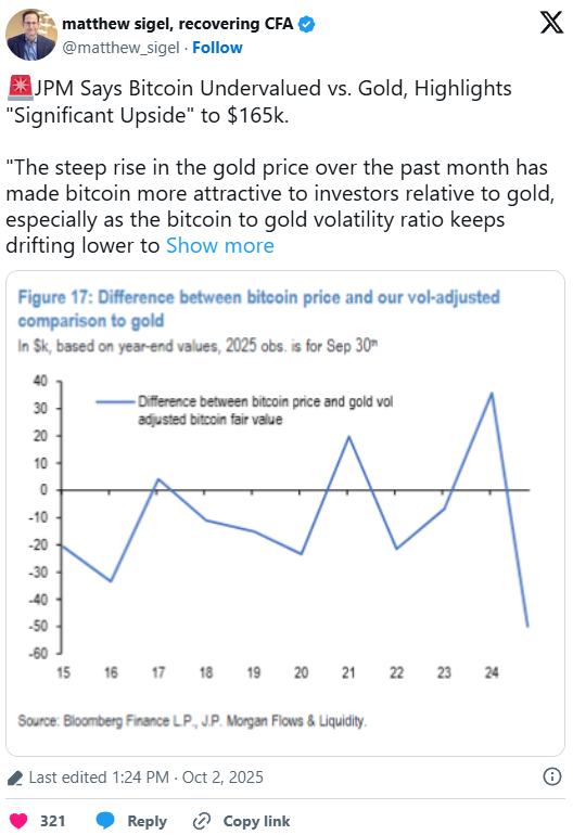 Auch die Citibank ist bullisch und geht in ihren Prognosen sogar noch einen Schritt weiter: Ihre Analysten sehen Bitcoin bis 2026 bei rund 235.000 US-Dollar. Diese Einschätzung signalisiert, dass große Banken nicht nur die defensive Funktion von Bitcoin im Blick haben, sondern auch massives Aufwärtspotenzial sehen. Die jüngste Analyse von JP Morgan impliziert weitreichende Folgen für den Markt. Die Bank betont, dass Bitcoin im Verhältnis zu Gold derzeit unterbewertet sei und rechnet vor, dass der Marktwert von Bitcoin um rund 42 Prozent steigen müsste, um auf risikobereinigter Basis mit den rund sechs Billionen US-Dollar privater Gold-Investments gleichzuziehen.