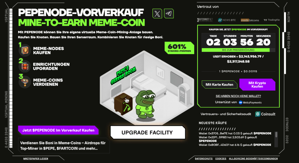 Spannend für Anleger sind im aktuellen Marktumfeld auch jene Coins, die sich noch vor ihrem ersten Börsenlisting befinden und dementsprechend gar nicht von den aktuellen Kryptokorrekturen beeinflusst werden. Tatsächlich gibt es auch viele Coins, die trotz negativem Marktklima starke Kapitalzuflüsse erfahren. Ein interessantes Beispiel ist hier das junge Meme-/Krypto-Mining-Projekt PEPENODE. Wie der Name verrät, setzt man auch hier auf das beliebte Pepe-the-Frog-Meme-Franchise.