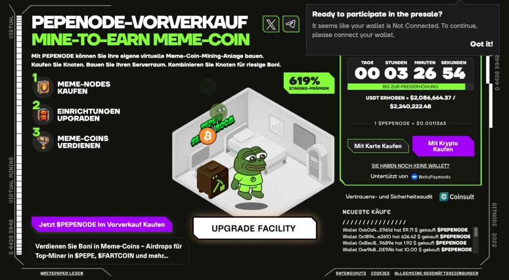 Das heißt, dass ein Teil des gesamten Coin-Supplys schon vorab an interessierte Anleger verkauft wird. So kann man sich einen besonders günstigen Einstieg sichern. Der Kurs pro Coin beträgt hier derzeit nur 0,0011363 $. Bisher kamen schon über 2 Millionen $ an Presale-Funding zusammen, was auf jeden Fall für die Nachfrage nach PepeNode spricht.