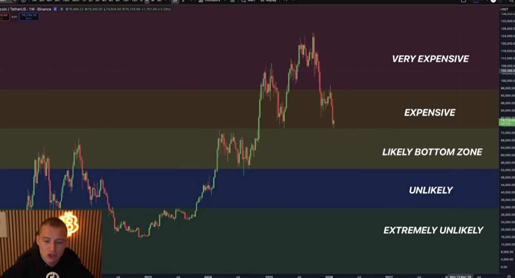 Aus technischer Sicht verweist er auf eine größere Konsolidierungsphase, in der Bitcoin schrittweise in niedrigere Preisbereiche abgleitet. Als relevante Zone für eine mögliche Bodenbildung nennt er einen Bereich zwischen 77.000 und 68.000 US Dollar. Innerhalb dieser Spanne plant er, Positionen sukzessive aufzubauen. Ein deutlich tieferer Rückgang unter 52.000 US Dollar wird zwar nicht ausgeschlossen, jedoch als wenig wahrscheinlich eingestuft. Erst unterhalb dieser Marke würde aus seiner Sicht ein Szenario eintreten, das eine außergewöhnlich aggressive Positionierung rechtfertigt.