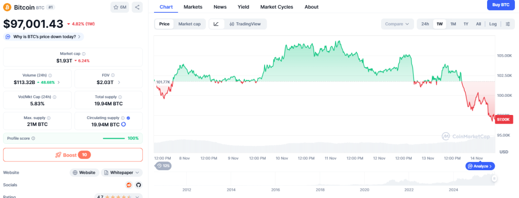 Das “Falling Wedge” liefert zwar theoretisch die Chance auf eine Umkehr, doch die aktuelle Struktur wirkt fragiler als in früheren Situationen. Die Liquiditätsbereiche auf der Unterseite wurden zügig abgeholt, und der anschließende Gegenstoß fiel spürbar kleiner aus. Die Heatmap zeigt erneut tiefe Pools zwischen 97.000 und 96.000, die bereits angetestet wurden. Solche Abräumbewegungen endeten früher oft in schnellen Rallys, doch der Markt wirkt diesmal zurückhaltender.