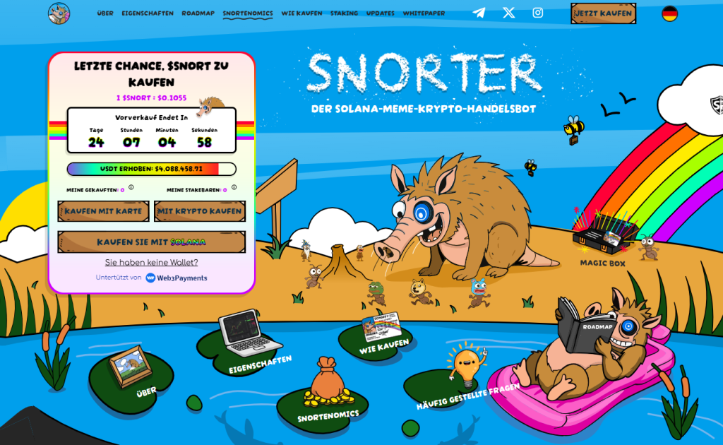Wenn Chancen in kurzen Zeitfenstern entstehen, entscheidet die Geschwindigkeit. Snorter ist ein Solana-basierter Telegram Trading-Bot, der Mempools in Echtzeit analysiert und dadurch frische Liquidität, neue Token und riskante Smart Contracts sofort erkennt. Mit Anti-Rug-Mechanismen und verifizierten Checks sollen Nutzer frühzeitig in Bewegungen einsteigen können, bevor breite Aufmerksamkeit den Markt verzerrt. Für Halter des Tokens ergeben sich direkte Vorteile: Handelsgebühren sinken auf 0,85 Prozent, zusätzlich gibt es unbegrenzte Snipes, Staking-Möglichkeiten, Governance-Rechte und Zugang zu erweiterten Analysen. Bereits über 4 Millionen US-Dollar flossen in den Vorverkauf, nun ist der Coin vor dem Launch noch um 0,1055 US-Dollar zu haben. Das Risiko des Memecoins scheint die Anleger nicht abzuschrecken, denn die Möglichkeit auf Gewinne um 1000 Prozent und mehr scheint ihnen wichtiger zu sein.