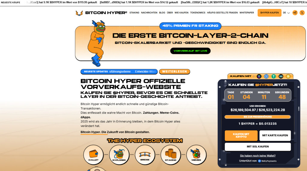 Der laufende Presale von Bitcoin Hyper hat bereits über 26,18 Millionen US-Dollar erreicht. Besonders auffällig ist das Engagement großer Investoren, die teils sechsstellige Summen investiert haben, trotz des Risikos, welche ein Memecoin mit sich bringt. Diese Entwicklung zeigt, wie stark das Interesse an Lösungen wächst, die Bitcoin technologisch erweitern.