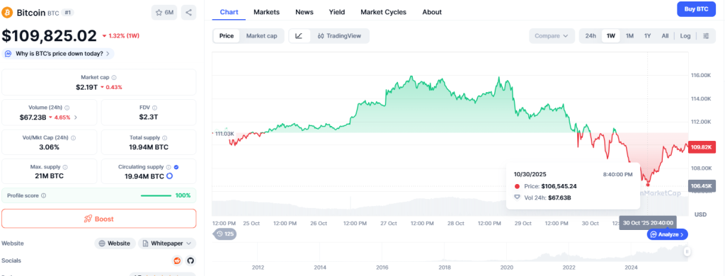 Bitcoin war gestern zwischenzeitlich auf 106.500 US-Dollar, Quelle: www.coinmarktecap.com