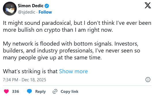 Der Krypto-Analyst Simon Dedic vertritt trotz dieser Ausgangslage eine klar bullische Haltung für die Zeit ab 2026. Seine Einschätzung basiert weniger auf kurzfristigen Kursbewegungen als auf einem außergewöhnlichen Auseinanderklaffen von Stimmung, Fundamentaldaten und Preisentwicklung. Dedic beschreibt eine Marktphase, in der selbst erfahrene Investoren, Entwickler und Brancheninsider aufgeben. Auffällig ist aus seiner Sicht, dass diese Resignation nicht von spekulativen Marktteilnehmern ausgeht, sondern von Akteuren, die den Kryptomarkt seit vielen Jahren begleiten. Genau darin sieht er ein klassisches Zeichen maximaler Kapitulation.