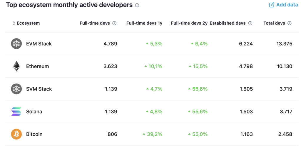 Wer einen Blick auf die aktuellen Entwicklerdaten im Kryptomarkt wirft, erkennt ein klares Bild: Ethereum ist weiterhin das mit Abstand führende Ökosystem, wenn es um aktive Entwickler, neue Protokolle und Innovationen geht. Auf den weiteren Plätzen folgt Solana, das sich als performante Alternative etabliert hat und stark an Bedeutung gewinnt. Bitcoin liegt in dieser Statistik zwar etwas zurück, doch das bedeutet keineswegs Stillstand. Im Gegenteil: Auch rund um Bitcoin wird intensiv an neuen Lösungen gearbeitet – von Layer-2-Ansätzen über Skalierungsmodelle bis hin zu neuen Anwendungsfällen. Innovation findet längst nicht mehr nur auf einer einzigen Blockchain statt. Hier zeigt sich Bitcoin insbesondere mit einem starken Entwickler-Wachstum in den letzten zwei Jahren, das Ethereum deutlich übertrifft.